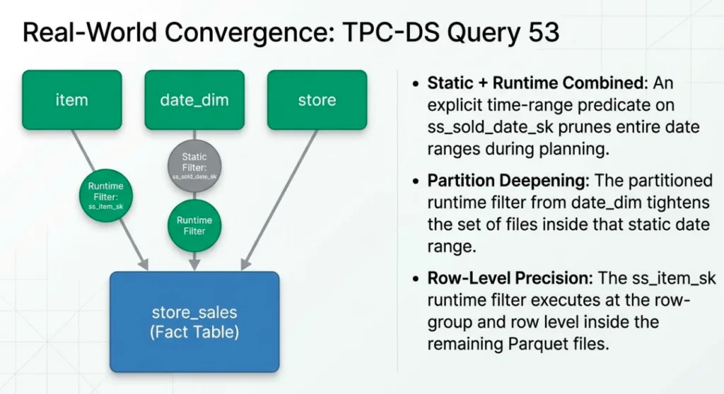At the same time, the query has an explicit time-range predicate on ss_sold_date_sk (a standard partition filter). That static predicate prunes away whole date ranges up front. The partitioned runtime filter further tightens the set of partitions and files within that range, while the ss_item_sk filter works primarily at the row-group and row level inside the remaining files.