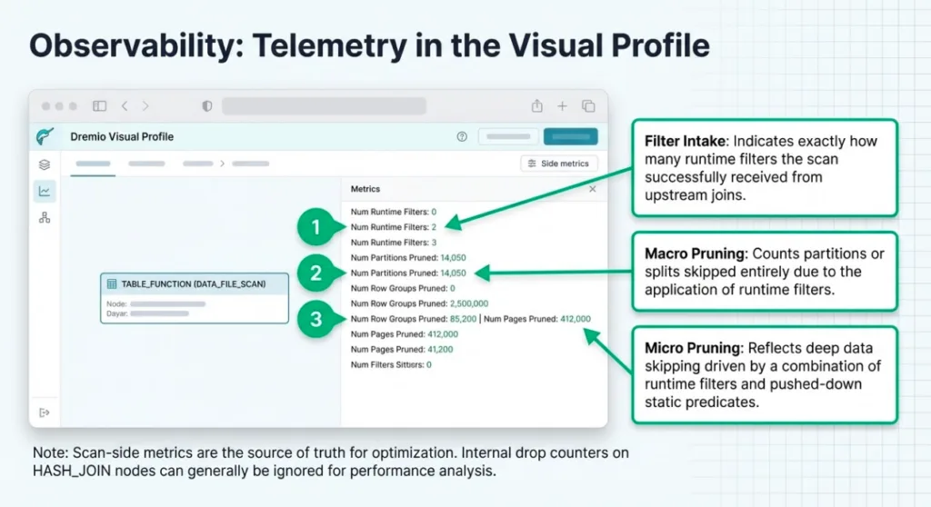 Make controlled changes. When experimenting with schema changes, reflections, or query rewrites, change one variable at a time and compare profiles. Look for differences in build‑side cardinalities, prune counts, and scan record counts to see whether runtime filters have become tighter or looser.