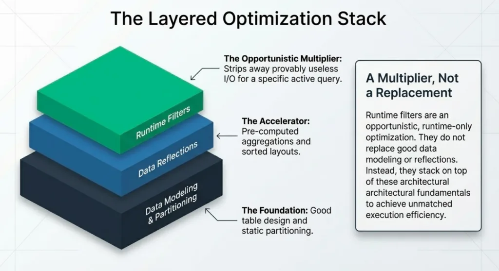 Taken together, these resources give you a framework for thinking about end‑to‑end performance: from how data is laid out on disk, to how Dremio chooses plans, to how runtime filters help those plans skip work at execution time.