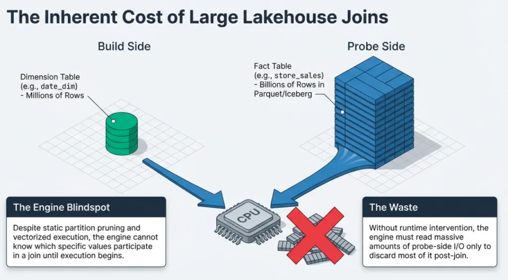 The expensive part of the join is usually the probe side scan. If we read a large Iceberg or Parquet-backed fact table and only a small fraction of rows actually join, most of the I/O and CPU spent on the probe side is wasted work.