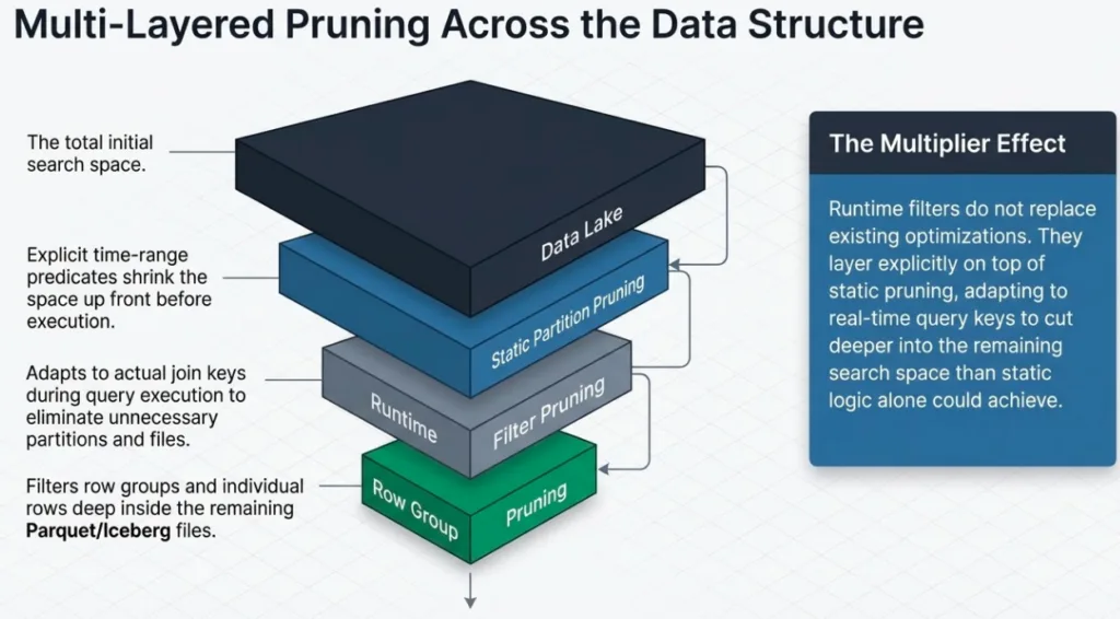 On Iceberg- and Parquet-backed tables, runtime filters can be applied at several layers in the plan: