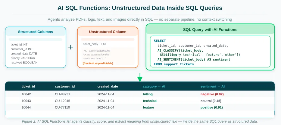 Figure 2: AI SQL Functions let agents analyze unstructured text (ticket bodies, reviews, documents) inside the same SQL query as structured data. No separate pipeline, no context switching.