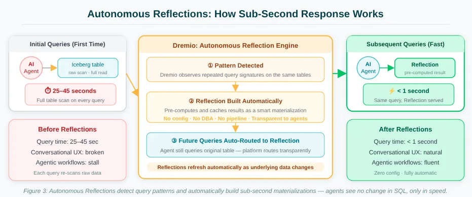 Figure 3: Autonomous Reflections require zero configuration. Dremio detects patterns, builds the acceleration structure, and routes future queries transparently. Agents see the same SQL, just much faster results.