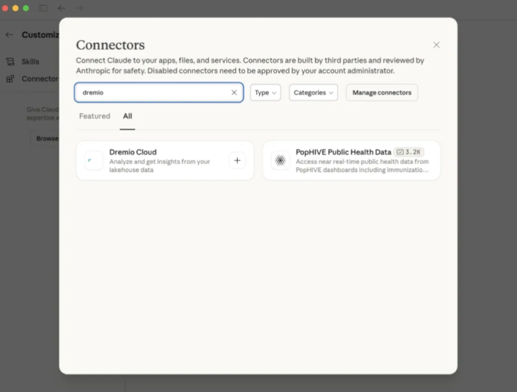 Today, we fix that. You can now connect Claude to Dremio as your dedicated data analyst using our Model Context Protocol (MCP) server. The new connector integrates Claude Desktop directly into your Dremio environment with a single click.